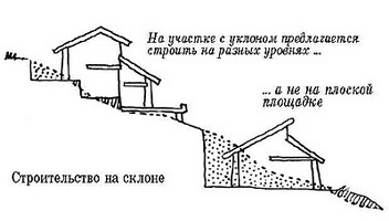 Если участок находится на плохо осушаемой земле и в дождливом климате, стройте на склоне, чтобы создать искусственный дренаж вокруг дома.