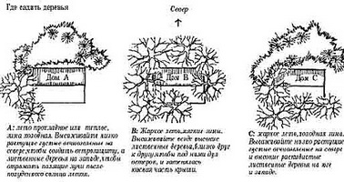 убежищем и раскалённой печкой. Ищите участок с деревьями на юго-западной и западной сторонах. Лиственные деревья особенно полезны, потому что они закрывают летнее солнце, но пропускают солнечные зимние лучи. Если на потенциальном участке присутствует тень от деревьев с южной стороны, рассмотрите возможность вырубки или основательной подрезки в разумных пределах. Во всех, кроме самых жарких регионов, у Вас должно быть открытое небо на юге, чтобы зимой было тепло.
